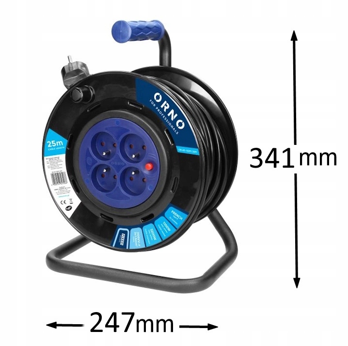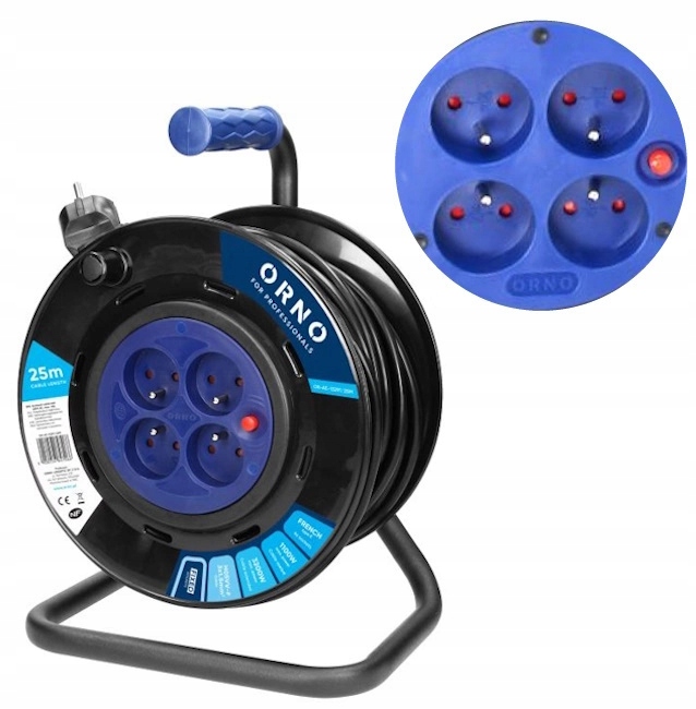- 1 szt. Przedłużacz bębnowy, 4 gniazda 2P+Z, kabel PVC H05VV-F 3x1,5mm², długość 25m, stałe gniazda, termik, przesłony torów prądowych
